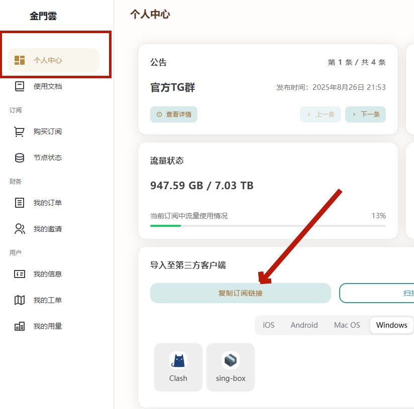 打開金門雲官網(https://www.ikm777.com/) 獲取訂閱的地址,復製訂閱。
