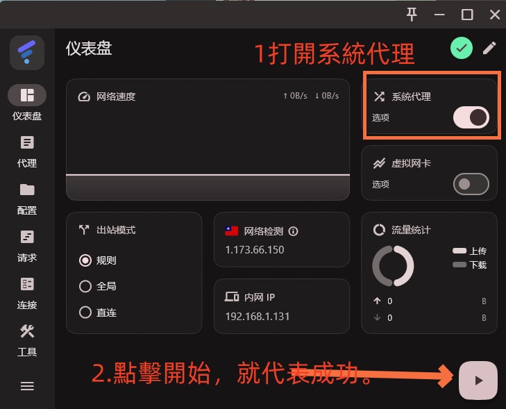 回到儀表盤,右下角有一個啟動按鈕,點擊後即可開啟代理。默認設置會開啟系統代理,這樣啟動後就可以直接在瀏覽器進行科學上網了。如果希望所有網絡流量都經過 FlClash,可以開啟 TUN 模式,這樣會有更好的翻墻效果。